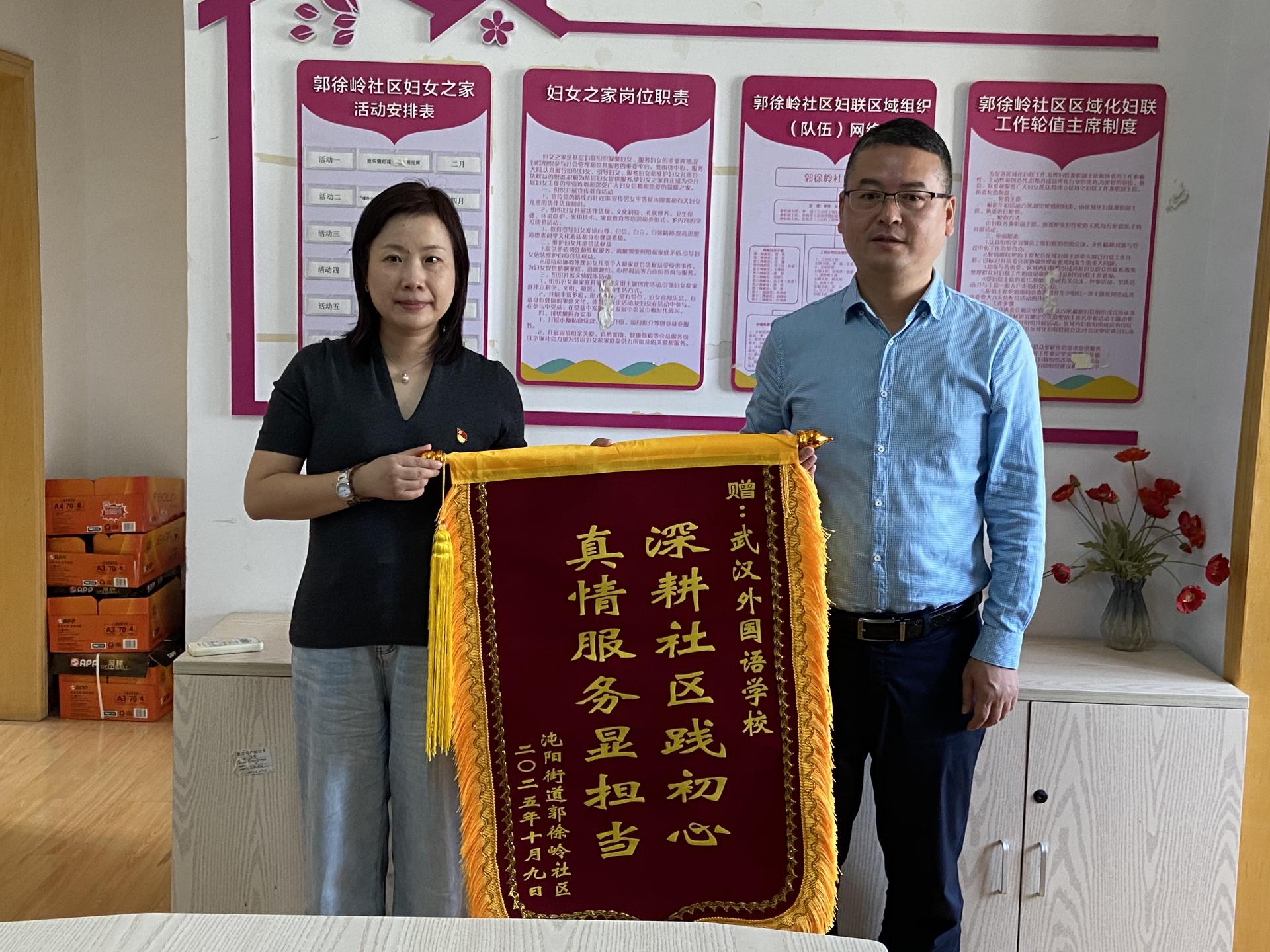 仪式尾声,蔡书记代表社区向学校赠送锦旗。锦旗上的真挚赠言,不仅承载着社区对学校深深的谢意与祝福,也寄托了对双方情谊永固、合作长存的美好愿景。
